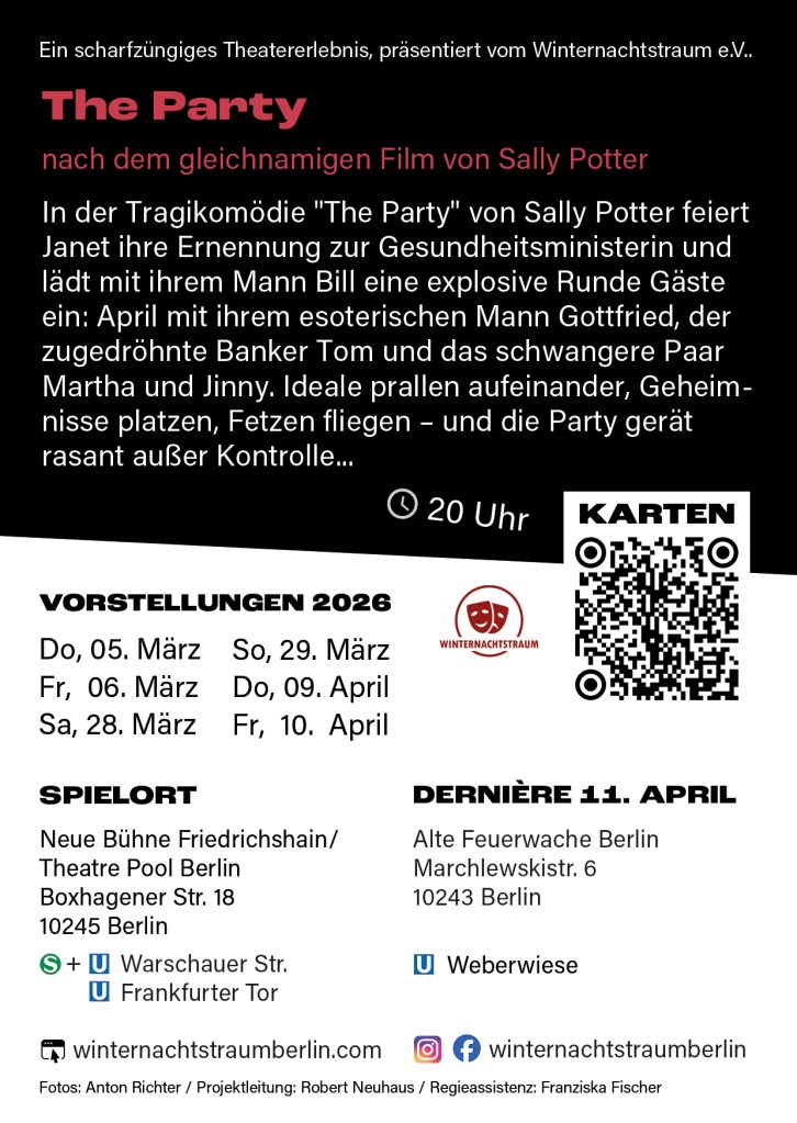 Wir sind ein Theaterverein aus dem Herzen Berlins und führen Theaterstücke mit unserem leidenschaftlichen Ensemble auf.